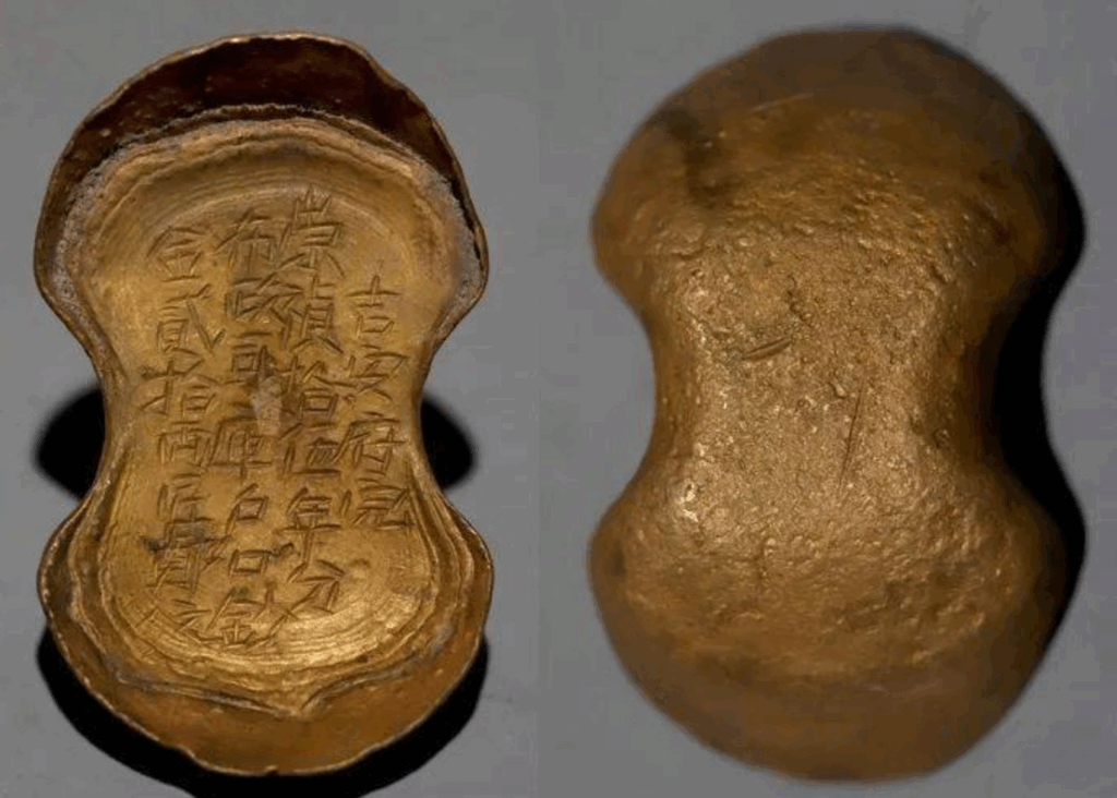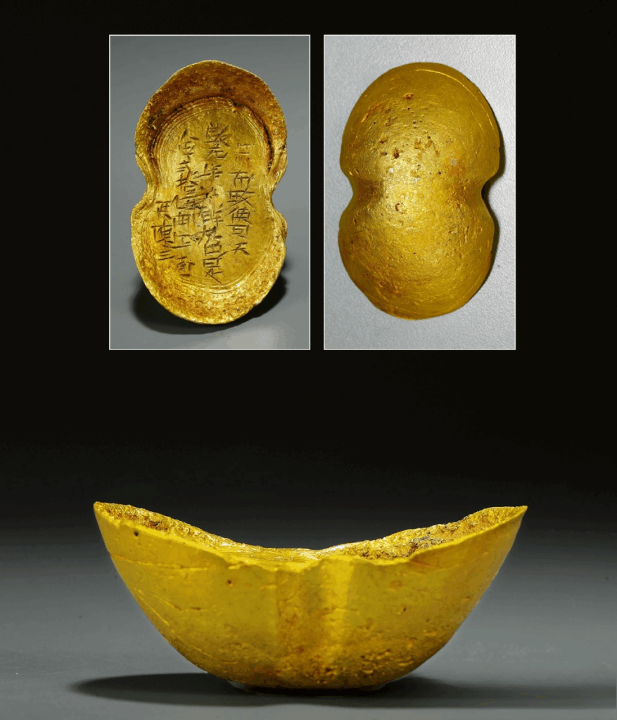Inscribed with “Craftsman Xiang Wulang,” “Fully Pure Gold,” and “Twenty-Five Taels,” this ingot reflects the booming economy of the Southern Song despite political turmoil. Gold was not used directly in markets but exchanged for copper currency. The craftsman’s mark demonstrates a mature system of gold production.