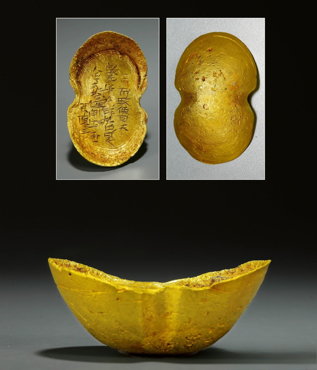 刻有「相五郎」、「十分金」與「重貳拾伍兩」銘文。南宋時期雖然政局動盪,但商品經濟發達,黃金使用量超過前代。黃金雖不直接參與市場流通,但可兌換銅錢進行交易。金錠上的匠名標記,體現了當時金銀製造業的成熟體系。