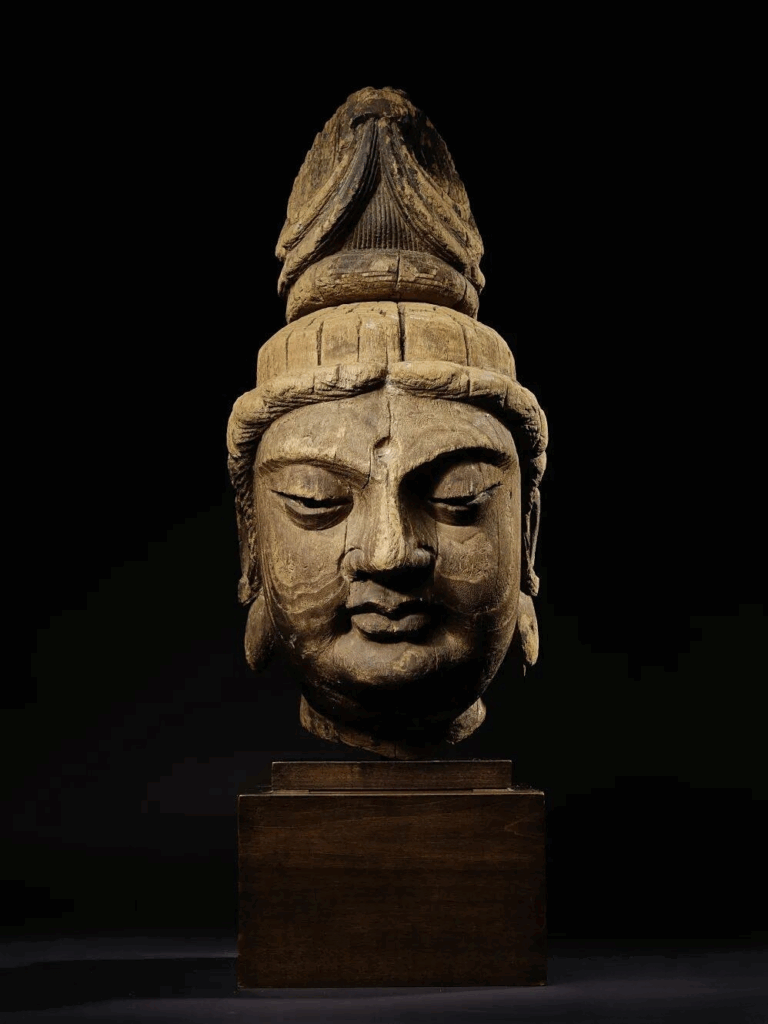 Carved from wood, this Bodhisattva head displays an elaborate high chignon, full face, upward-slanting eyes with gleaming glass pupils—so lifelike it seems to breathe. Imagine devotees kneeling before the complete statue, sincerely praying and cultivating virtue.
