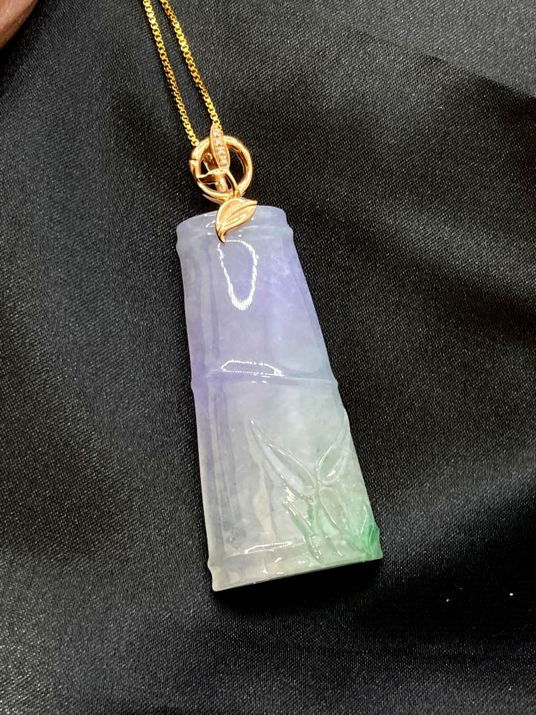A stunning close-up of the Natural Ice-type Tricolor Jade Pendant, showcasing its intricate hand-carved bamboo joint design, vibrant purple-green-white jade gradients, and sparkling diamond accents set in warm 18K rose gold.Natural Ice-type Tricolor Jade Pendant Set with 18K Rose Gold and Diamonds