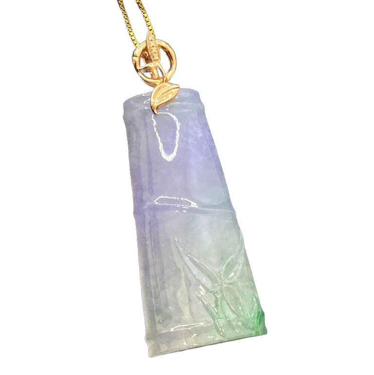 This elegant Natural Ice-type Tricolor Jade Pendant features a hand-carved bamboo joint design in purple, green, and white jade, set in 18K rose gold with diamond accents. A symbol of continuous progress and Eastern charm, perfect for collectors and high-end jewelry lovers.