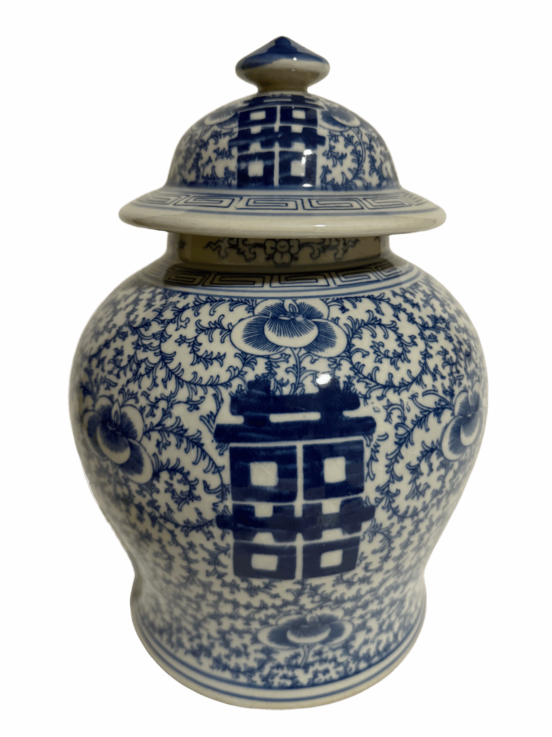 • 工藝特色:以傳統青花技法手工繪製經典「囍」字紋與纏枝花卉圖案,構圖飽滿對稱。器型為經典將軍罐式樣,壺身比例勻稱,帶有原配蓋子,體現民窯陶瓷實用與審美兼具的特點。