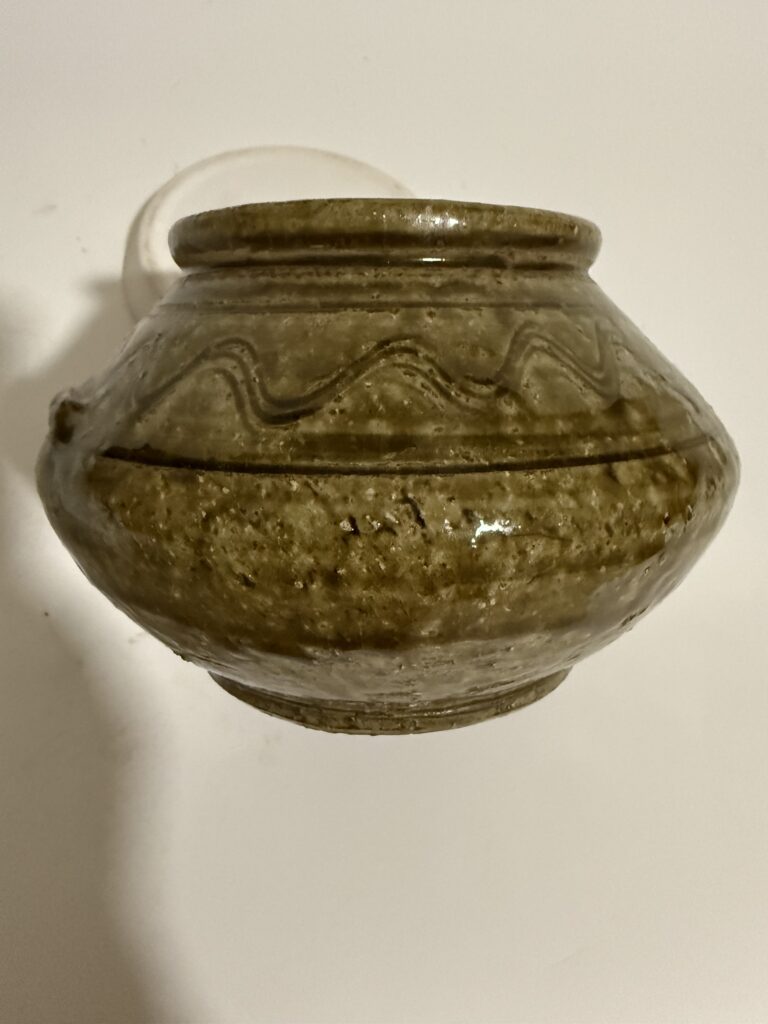 The jar is made of fine clay as the body. The body is firm and compact, showing stable physical properties after high – temperature firing. The surface is coated with yellow glaze, with a steady and ancient – looking color, presenting the unique “blue – yellow glaze” style of the Eastern Jin Dynasty. The glaze surface is as smooth as jade, with natural fine crackles (ice – crack patterns), which are typical signs of the firing process of that era. The glaze layer covers evenly, and there are slight glaze surface abrasions and patinas in some parts due to the long – standing time, adding a sense of historical vicissitude.
