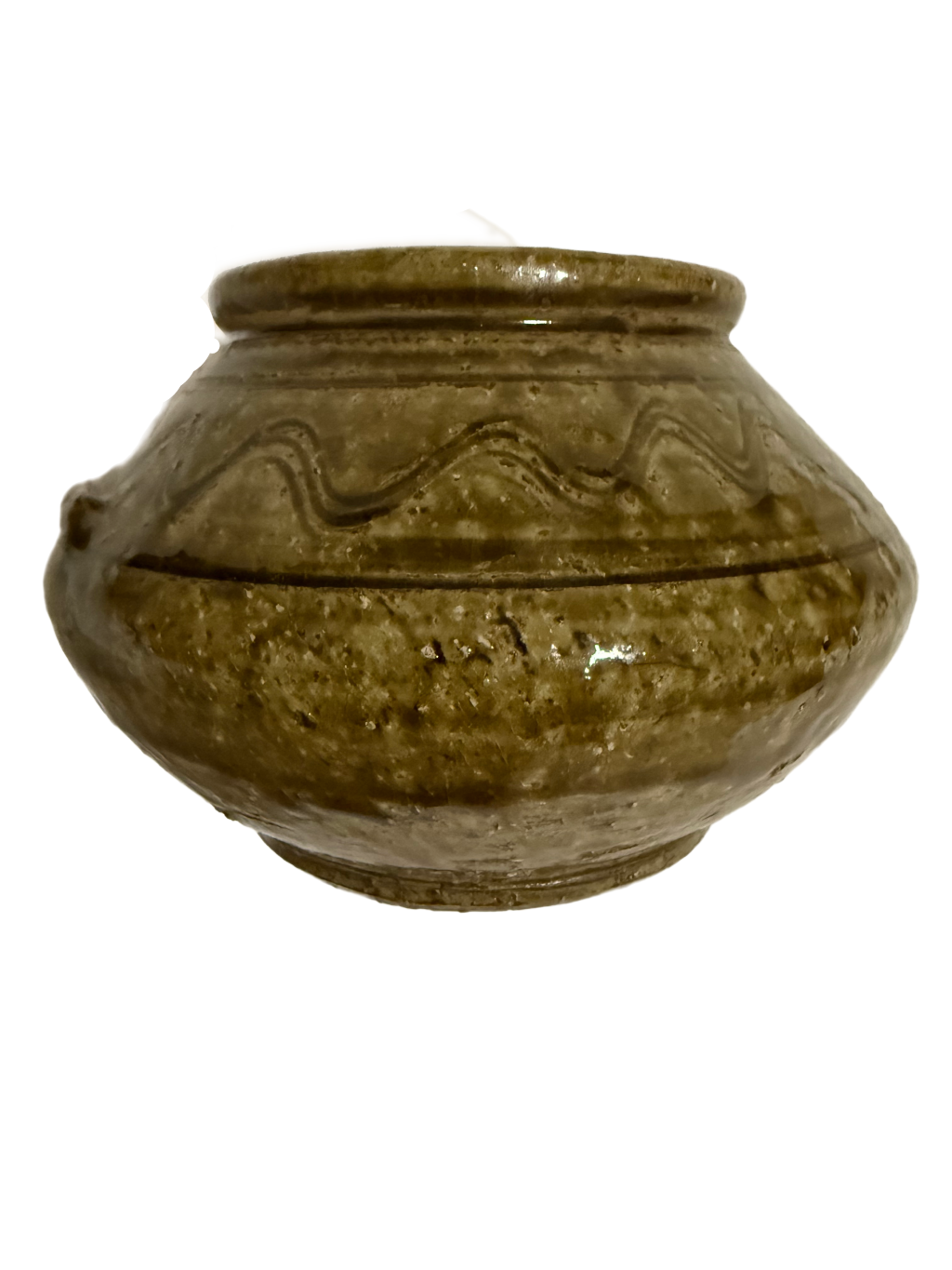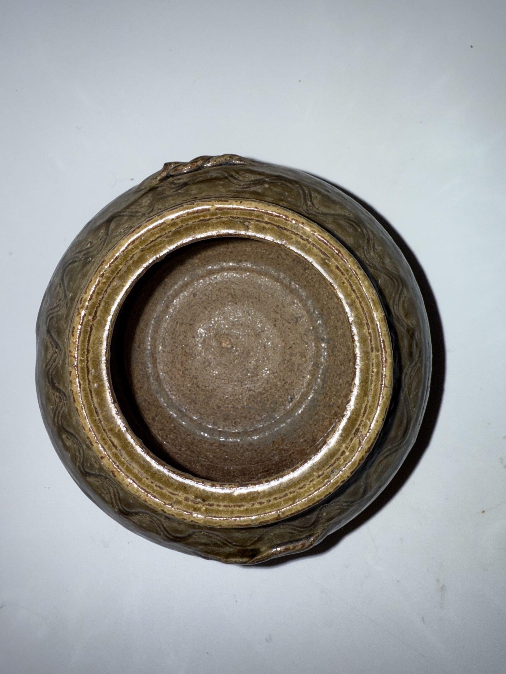 The jar is formed using the “pottery wheel throwing” technique. The shape is full and well – proportioned, with an outward – flaring mouth, a short neck, a round and bulging belly, and a stable ring foot. The overall lines are smooth and round, reflecting the Eastern Jin ceramic’s aesthetic pursuit of “naturalness”. The belly is mainly decorated with “chord patterns” and “wave patterns”. Continuous wave – shaped patterns are engraved on the upper part, with flowing and dynamic lines, symbolizing the Eastern Jin people’s aesthetic yearning for natural landscapes. The lower part is separated by several parallel chord patterns, enhancing the sense of hierarchy of the shape. There are symmetrically – decorated “running beast” – shaped ears (beast – head – shaped through – ears) on the shoulder. The outline of the beast head is full, and although the facial features are simply depicted, they are vivid in expression, demonstrating the combination of realism and abstraction in the Eastern Jin pottery art.