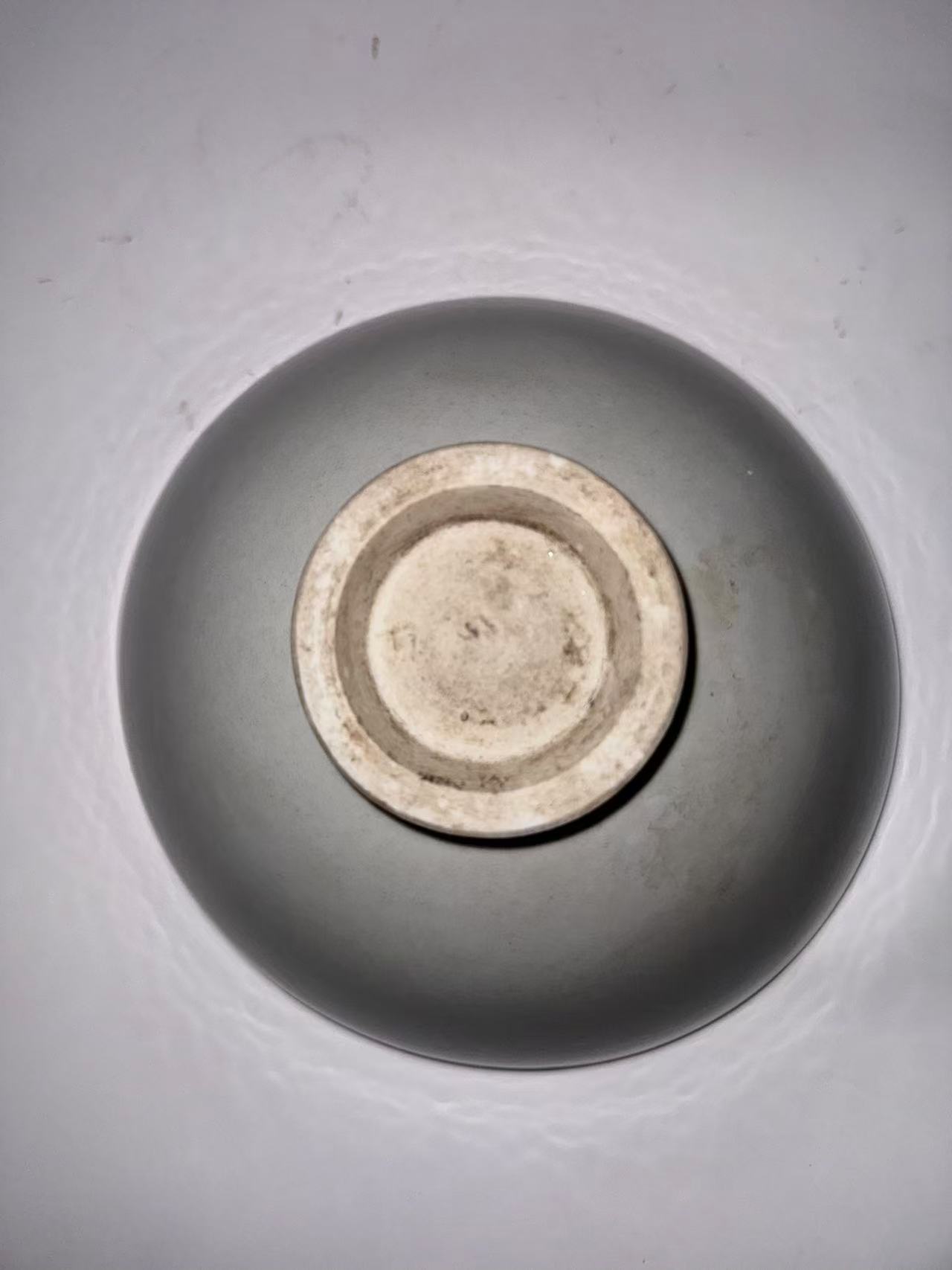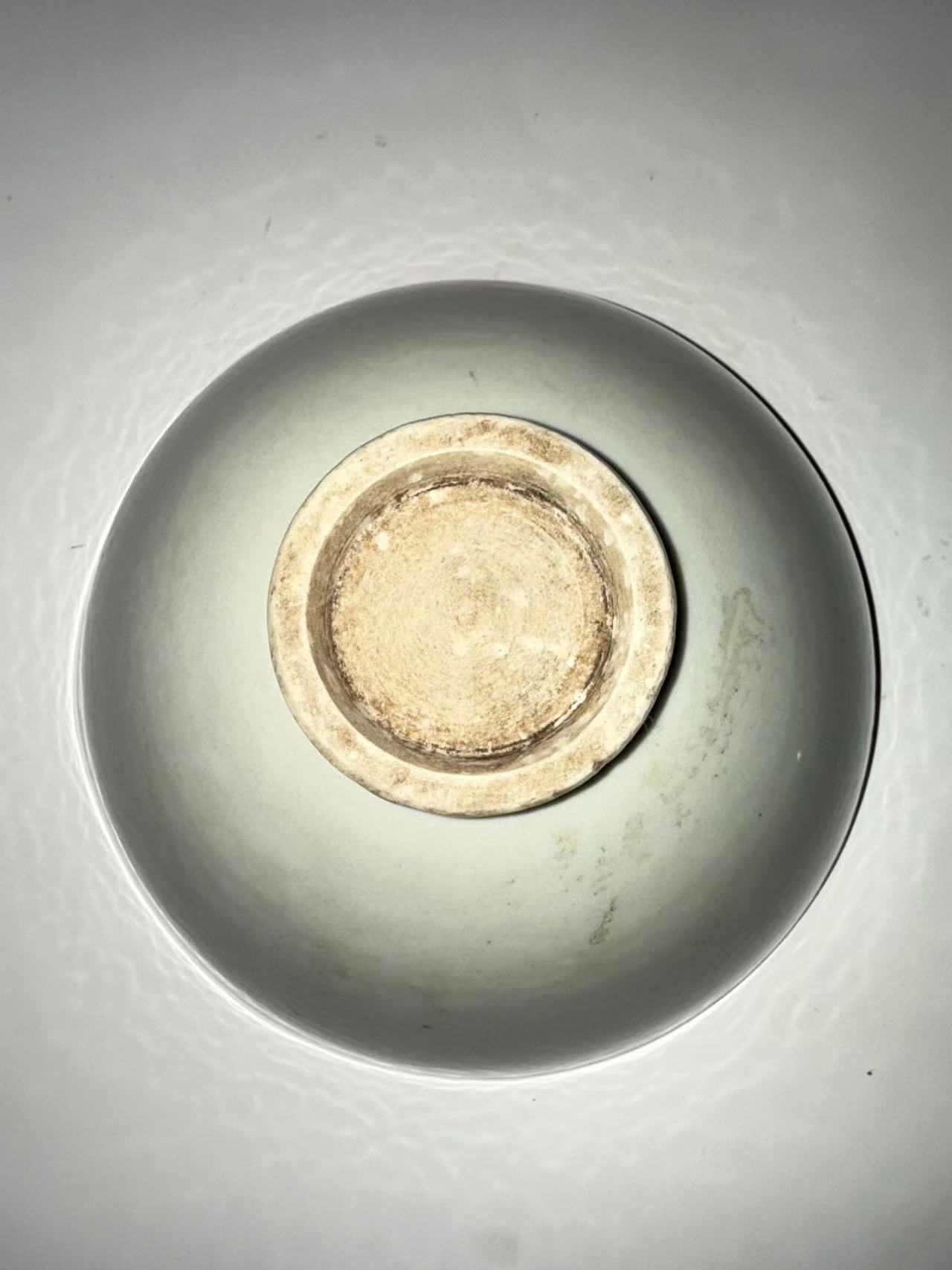 碗身施典型「樞府釉」,釉色呈現獨特的卵白色,白中微泛青灰,猶如凝脂,質感溫潤如玉。釉面緊密堅致,經高溫燒制後形成細膩開片,紋理自然,歷經數百年時光仍保持完好光澤。
