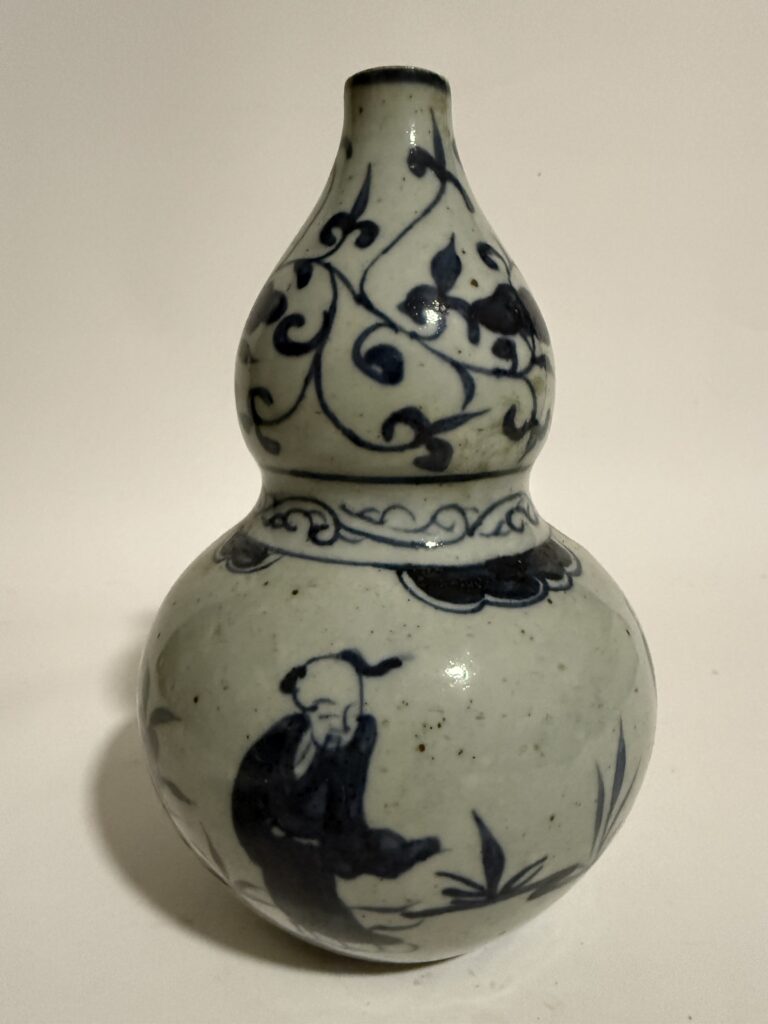 • Craftsmanship Features: Traditional underglaze blue (qinghua) decoration with two distinct sections – the upper bulb showcases scrolling lotus vines, while the lower bulb depicts a scholar figure amidst bamboo, rendered in bold, fluid brushstrokes with classic Ming Dynasty blue pigmentation.
