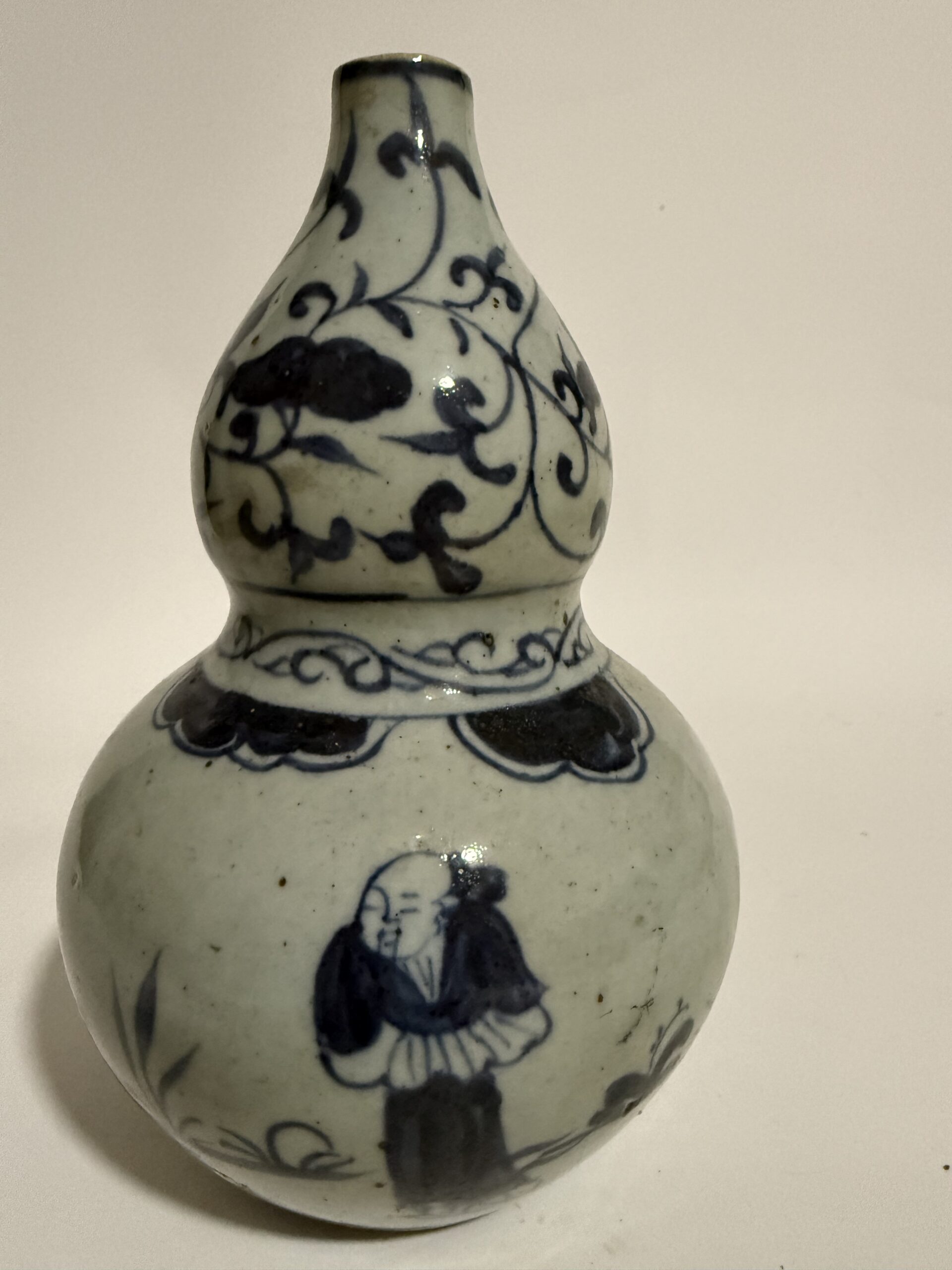 • Craftsmanship Features: Traditional underglaze blue (qinghua) decoration with two distinct sections – the upper bulb showcases scrolling lotus vines, while the lower bulb depicts a scholar figure amidst bamboo, rendered in bold, fluid brushstrokes with classic Ming Dynasty blue pigmentation.