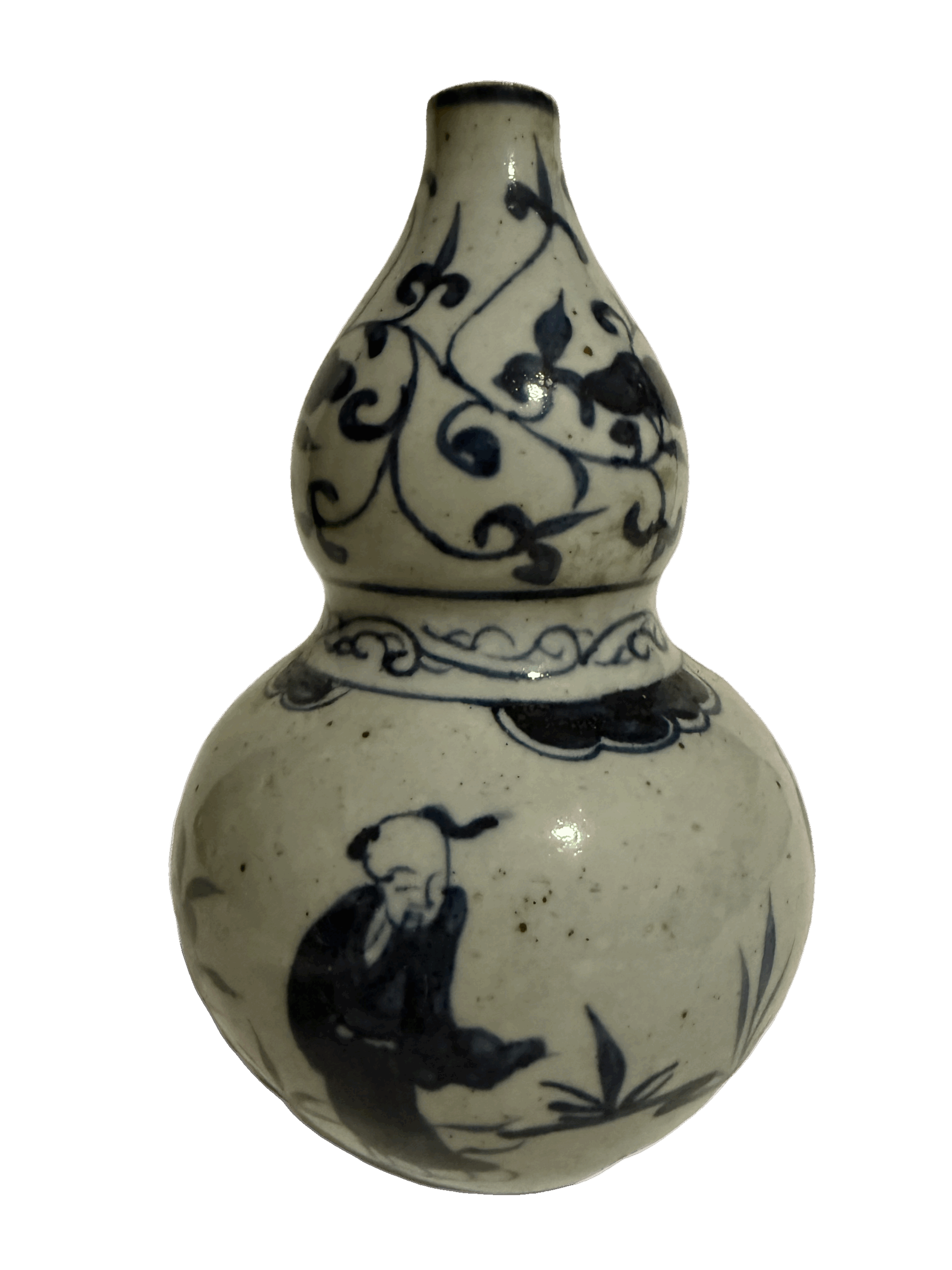 明代是中國青花瓷發展的黃金時代,技術成熟且產量大增,不僅供皇室貴族使用,亦廣泛流行於民間。葫蘆瓶因「葫蘆」諧音「福祿」,成為明代民間最受歡迎的器型之一,既是陳設雅器,亦蘊含祈福納祥的文化寓意。本品所繪纏枝紋與高士圖,更是明代社會「崇古尚雅」風氣的縮影,將實用功能、審美追求與文化信仰完美融合。