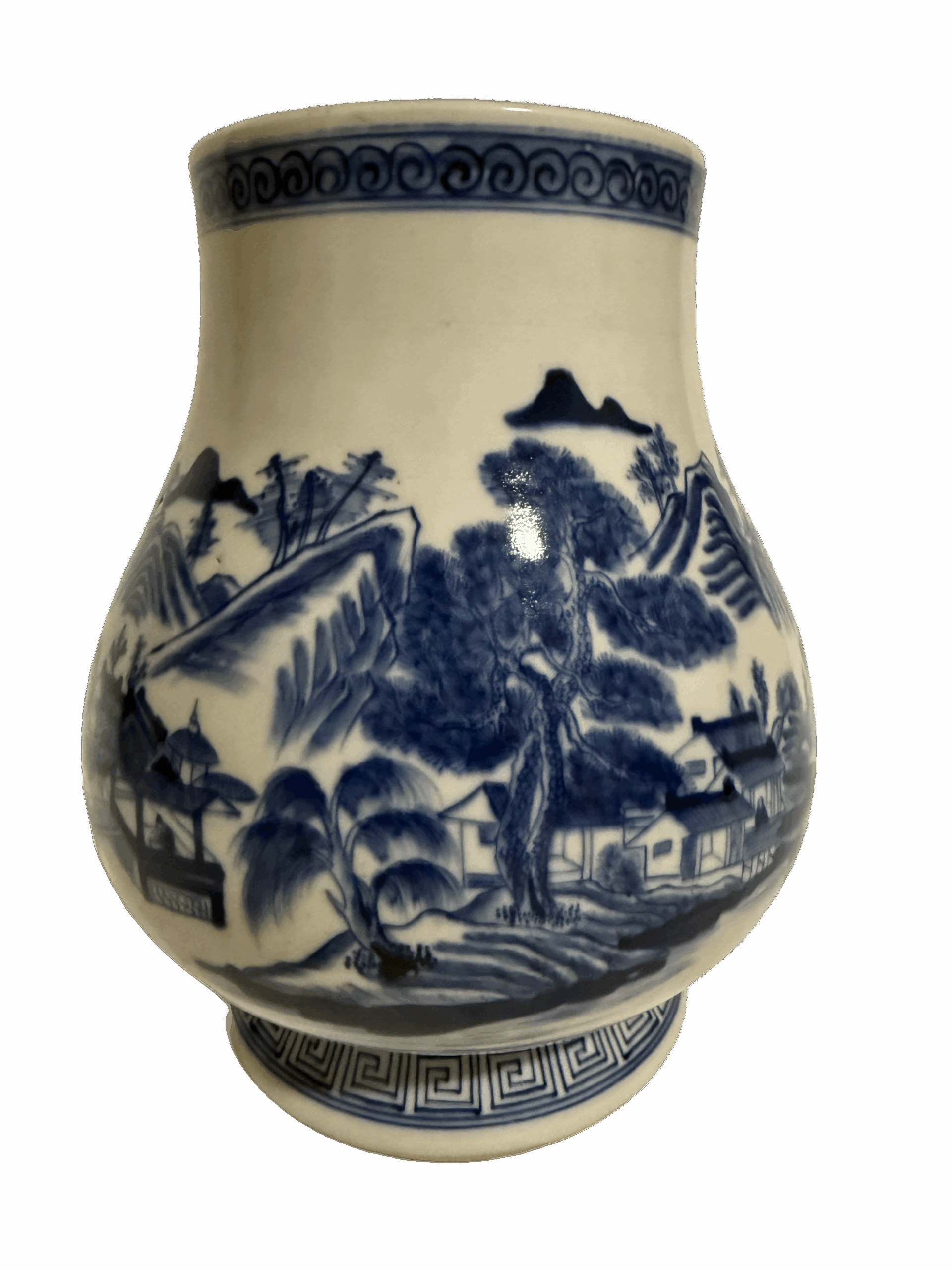 腹部主题:绘山水人物图,远山含黛,近树葱郁,亭台楼阁掩映于苍松翠柏之间,溪水潺潺,小径蜿蜒,一派“小桥流水人家”的江南隐居之景。画师以“分水皴法”表现山石肌理,青花浓淡渐变自然,近景山石用浓笔重彩,远景山峦以淡青渲染,形成“墨分五色”的立体效果,笔触劲健洒脱,人物、屋宇细节清晰可辨,尽显“咫尺千里”的山水意境;