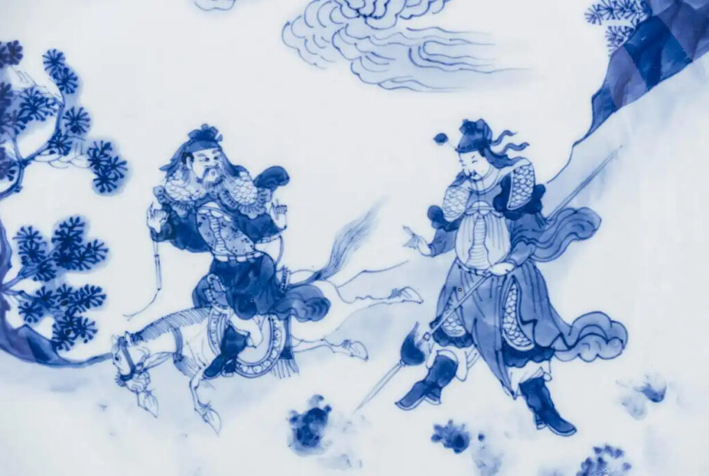 雄才大略的康熙帝將青花審美推向新高度,御窯廠在明代配方基礎上改良的青料,燒出了「翠毛藍」的典雅氣質。這種接近理想藍色的呈色,暗合滿清貴族對中原雅文化的認同與創新。故宮所藏康熙青花水滸人物盤上,人物衣紋處的青料深淺自如,山石皴染處的色階過渡,展現著宮廷畫師參與設計的藝術成就。此時的青花不再是單純的釉色裝飾,而是成為了承載文人畫意的立體畫布。