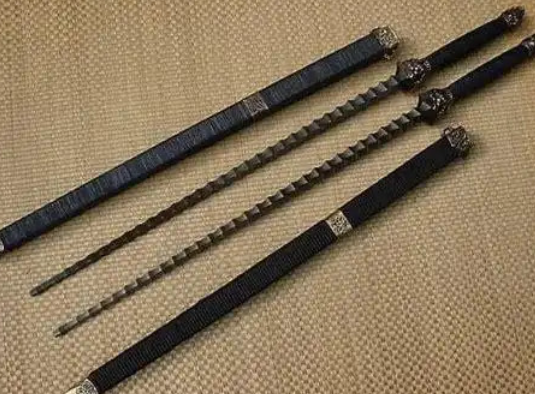 Historical Context: A short weapon, it typically has four edges and measures about four Chi in length (approximately 1.2 meters in the Song system), often used in pairs. Its weight requires significant strength to wield effectively. Its techniques are similar to those of the sword. Originating between the Jin and Tang dynasties, it is made of bronze or iron, resembling a hard whip but without joints or a sharp point. Its cross-section is square, often with a groove, earning it the name “Concave-Faced Jian.” Sizes vary, generally between 65-80 cm. Often employed as an auxiliary weapon to deliver surprising, fatal blows—hence the saying “杀手鐧” (killer mace, meaning a trump card). The Tang general Qin Qiong was famous for using dual Jian, as was Niu Gao, a general in Yue Fei’s army during the Southern Song. In folklore, the Eighth Prince Zhao Defang wielded a concave-faced golden Jian.