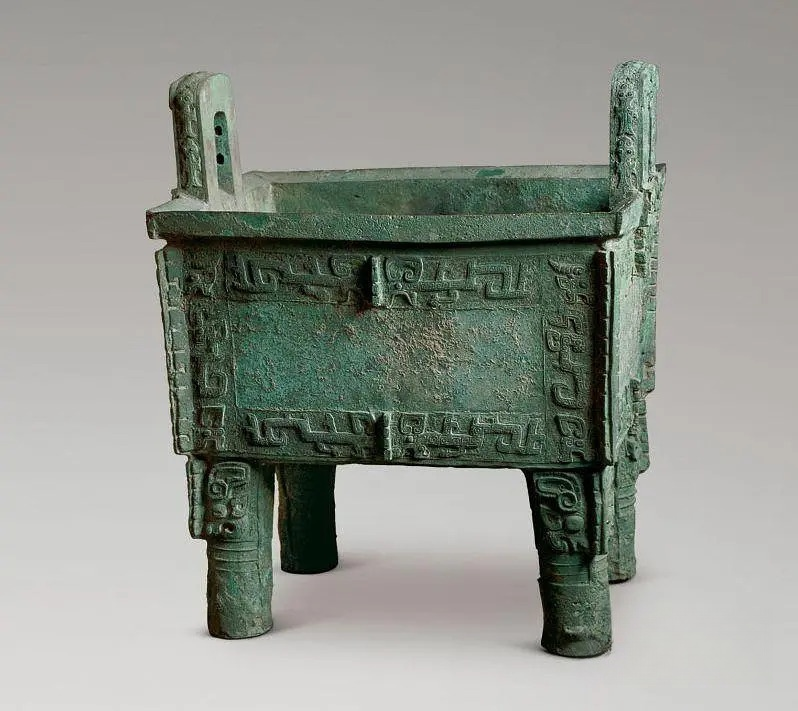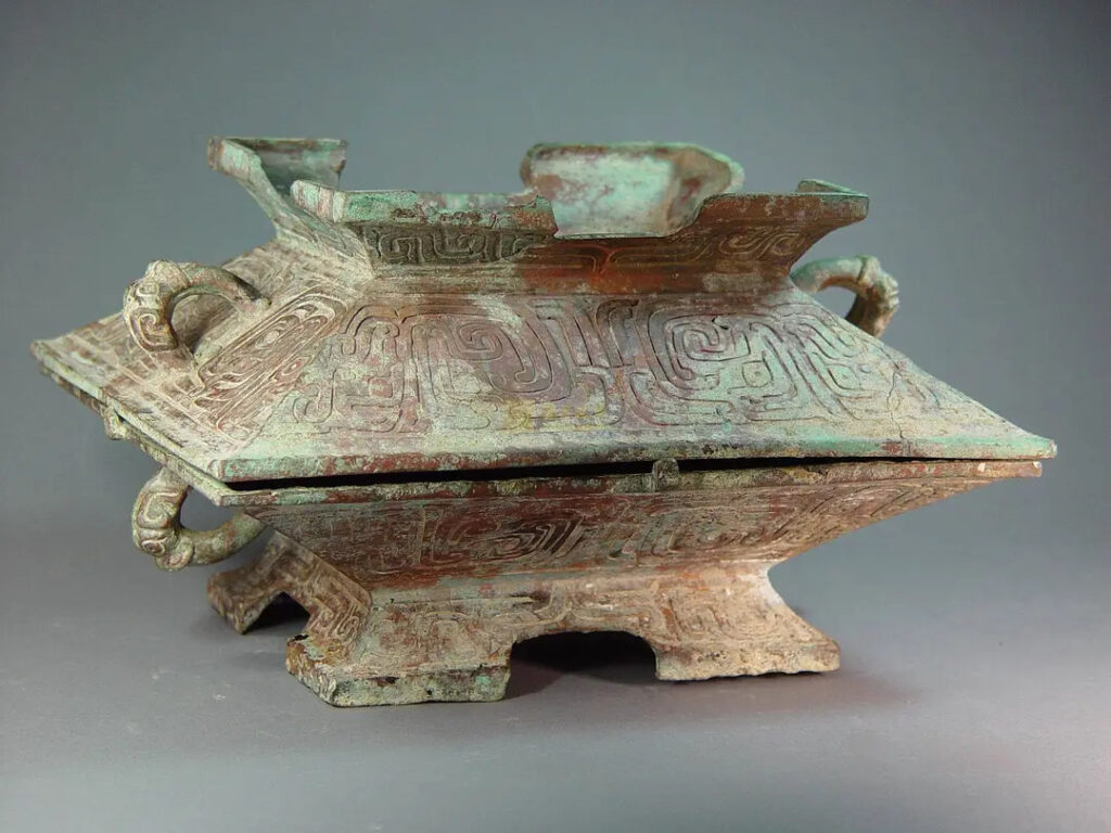 Rectangular wine vessel. “Yí” originally referred to all ritual bronzes, but this square form acquired its conventional name. Popular Mid-Shang to Early Western Zhou. Interestingly, lid decorations often appear inverted, possibly related to ritual placement.