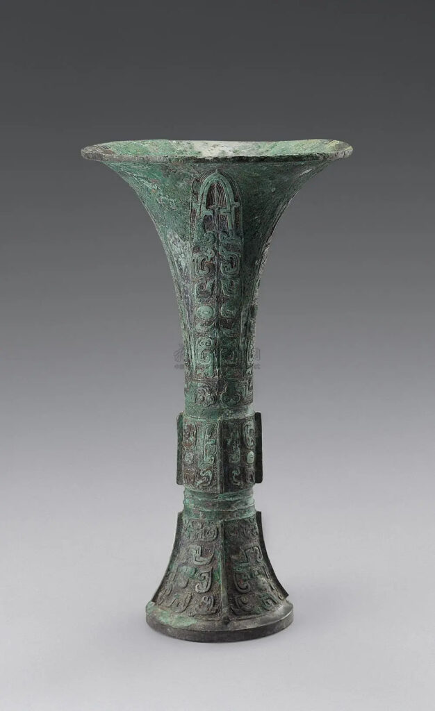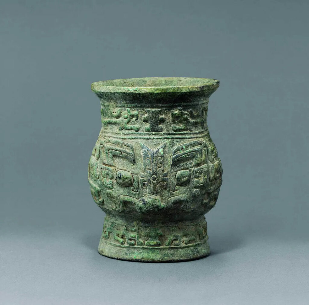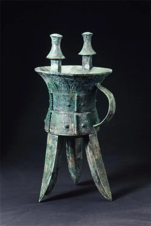 Drinking vessel, equivalent to modern wine cups. First appeared in Erlitou culture, earliest known wine vessel. Disappeared after Mid-Western Zhou.