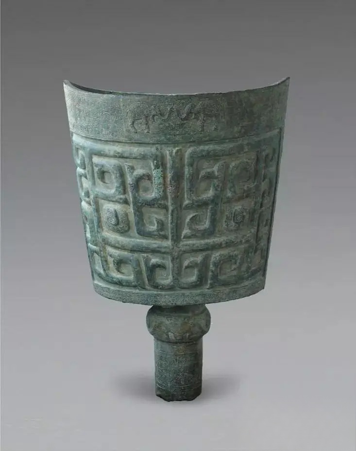 Percussion instrument for military commands. Popular Late Shang to Early Western Zhou. Held handle-upward and struck with wooden stick.
