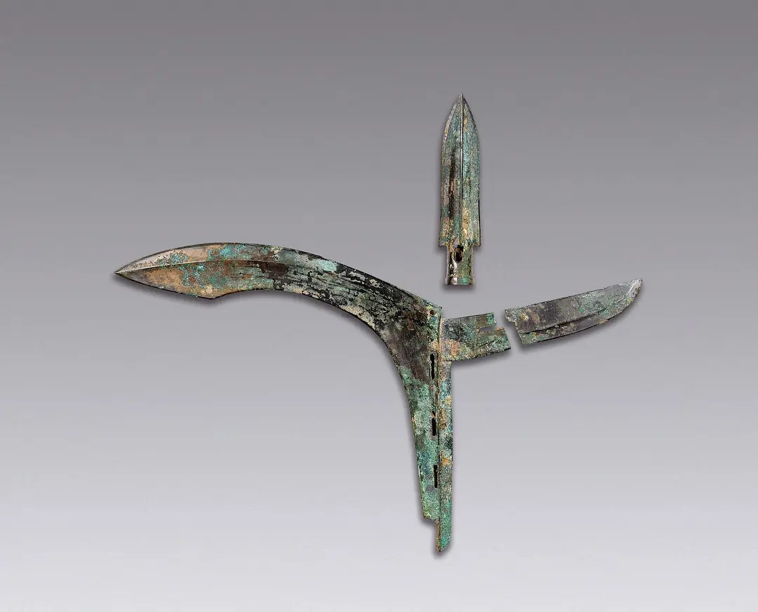 ② 戈:用於鉤殺的兵器。在青銅兵器中,戈是出現比較早的,在二里頭文化時期就已經出現,一直延續使用至戰國以後。