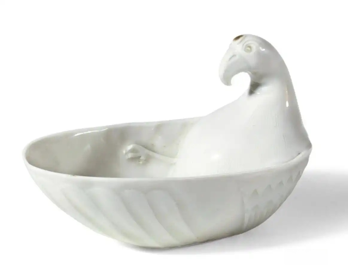 Yuan pieces focus on white-glaze with black designs, carving, and stamped patterns. A Yuan parrot-shaped cup with dot decoration sold for RMB 690,000 (Poly Beijing, 2018).